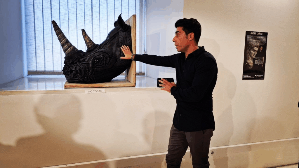 Ángel Cañas (Madrid, 1977), artista autodidacta, inició su trayectoria en la pintura, aunque pronto encontró en los materiales reciclados la vía idónea para expresar su visión artística. Su obra se centra en elementos altamente contaminantes como plásticos y caucho, a los que otorga una nueva vida mediante esculturas de gran realismo y fuerte personalidad. La propuesta busca concienciar sobre el valor de los residuos y el compromiso con el medioambiente.