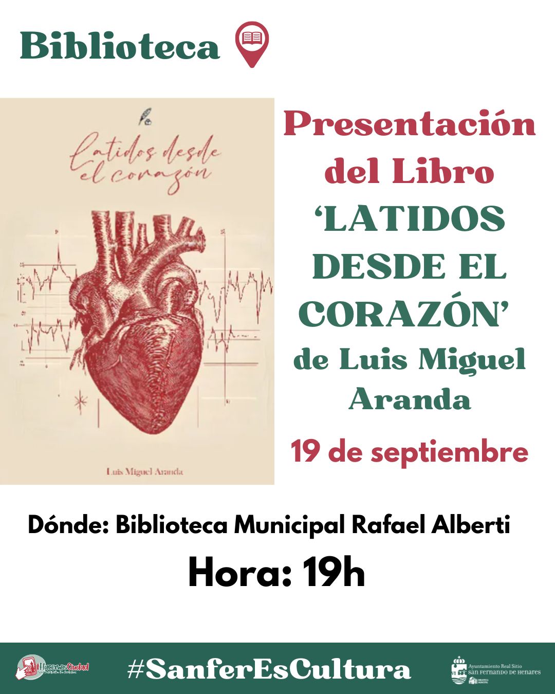 El próximo viernes 19 de septiembre, la Biblioteca Municipal Rafael Alberti de San Fernando de Henares será escenario de la presentación del libro Latidos desde el corazón, obra del autor local Luis Miguel Aranda.