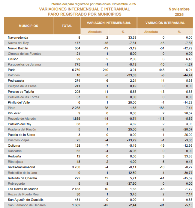 El número de personas en situación de desempleo en San Fernando de Henares alcanzó las 1.682 en noviembre de 2025. Así lo reflejan los datos publicados por la Consejería de Economía, Hacienda y Empleo de la Comunidad de Madrid.