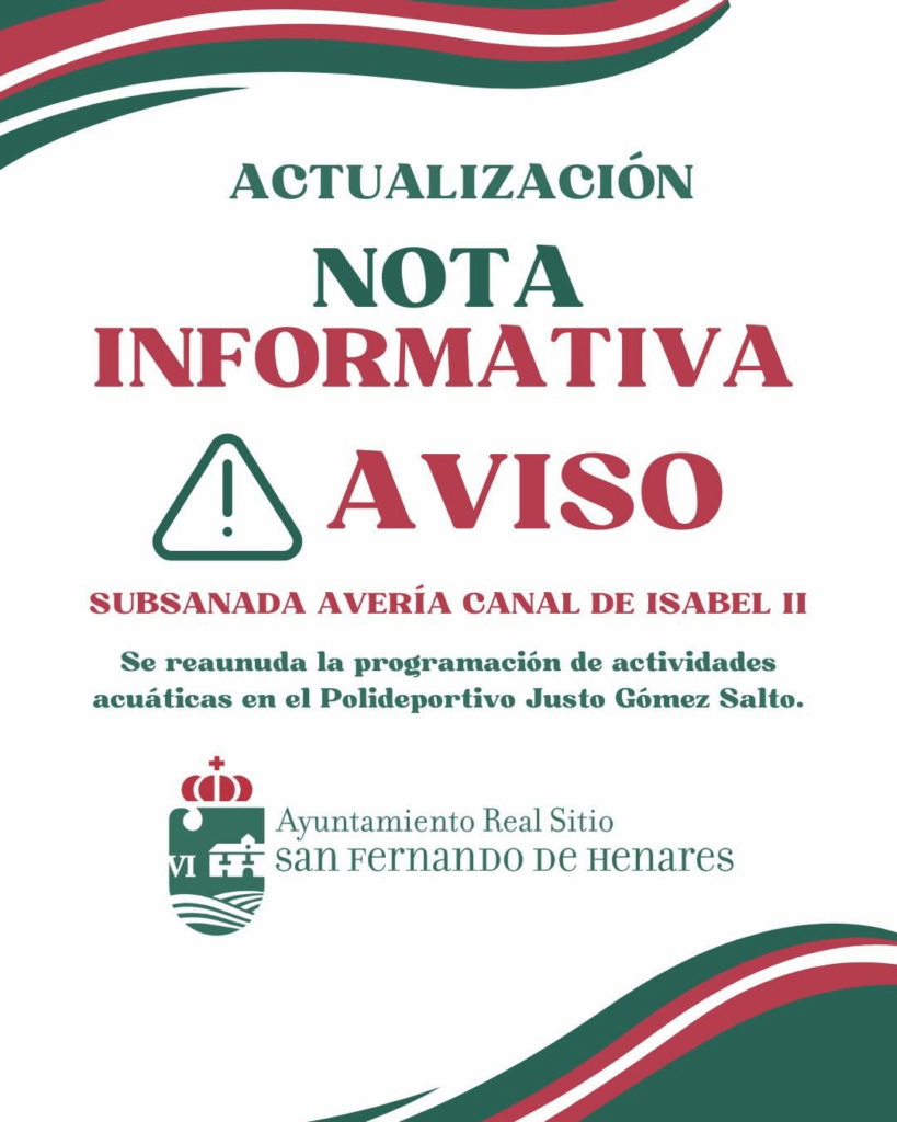 El Ayuntamiento de San Fernando de Henares ha informado de que la avería registrada en la red de suministro del Canal de Isabel II que afectaba directamente a las instalaciones del Polideportivo Municipal Justo Gómez Salto ya ha sido subsanada. El incidente ha provocado la interrupción temporal del servicio y la suspensión de todas las actividades acuáticas programadas que ya se han reanudado con normalidad en la franja de tarde y según los horarios habituales.