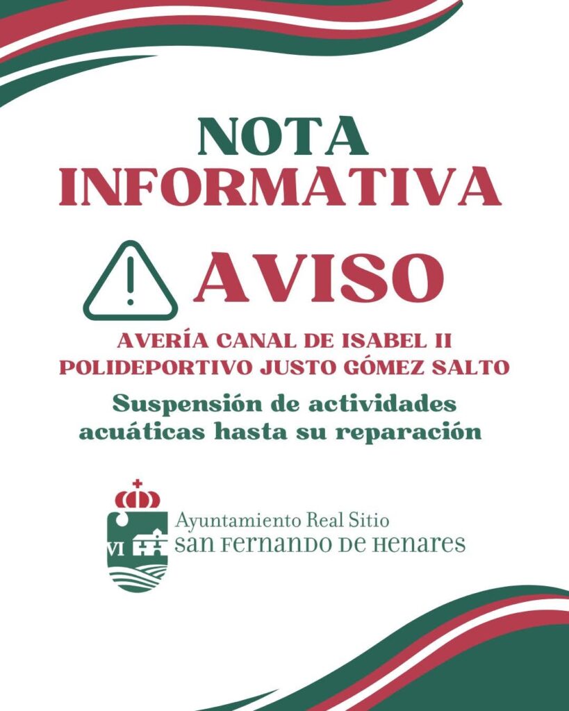El Ayuntamiento de San Fernando de Henares ha informado este lunes de una avería registrada en la red de suministro del Canal de Isabel II que afecta directamente a las instalaciones del Polideportivo Municipal Justo Gómez Salto. El incidente ha provocado la interrupción temporal del servicio y la suspensión de todas las actividades acuáticas programadas.