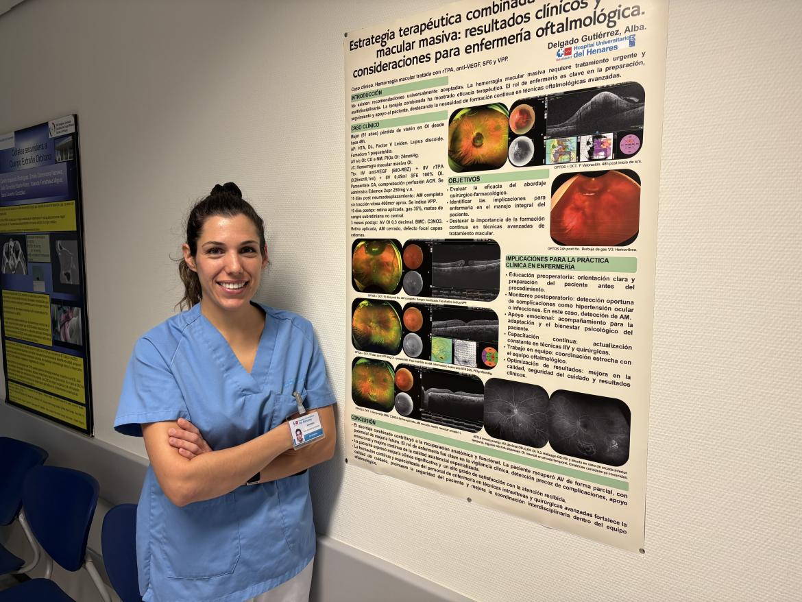 Se trata de Alba Delgado Gutiérrez, enfermera de consultas externas, y autora de un trabajo enfocado en un caso clínico de alta complejidad en el que se aplicó una estrategia terapéutica combinada para abordar una hemorragia macular masiva.
